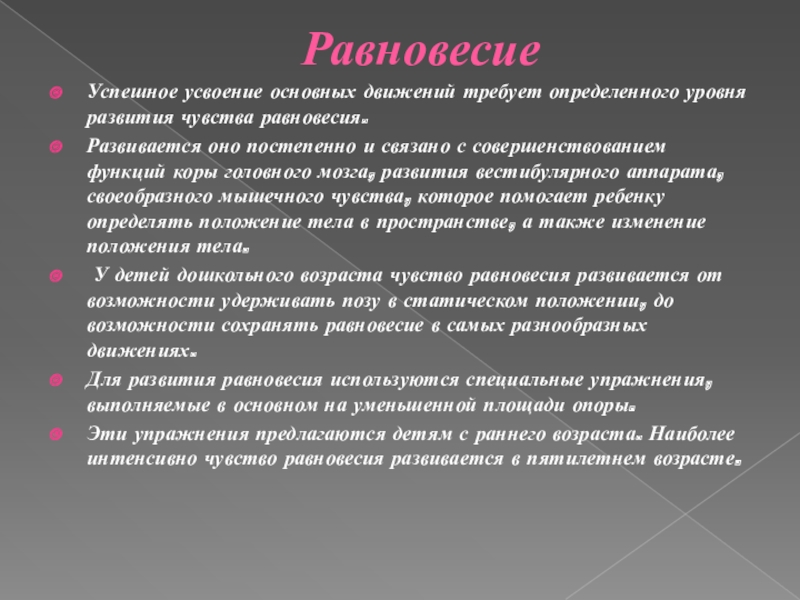У детей дошкольного возраста чувство равновесия развивается от возможности удерживать позу в статическом положении, до возможности сохранять равновесие в самых разнообразных движениях.