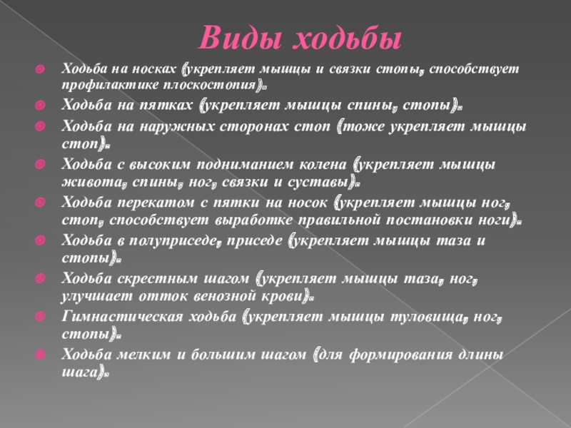 Упражнения в ходьбе различными способами (на носках, на пятках и др.) способствуют развитию и укреплению мускулатуры стоп, предупреждают плоскостопие.