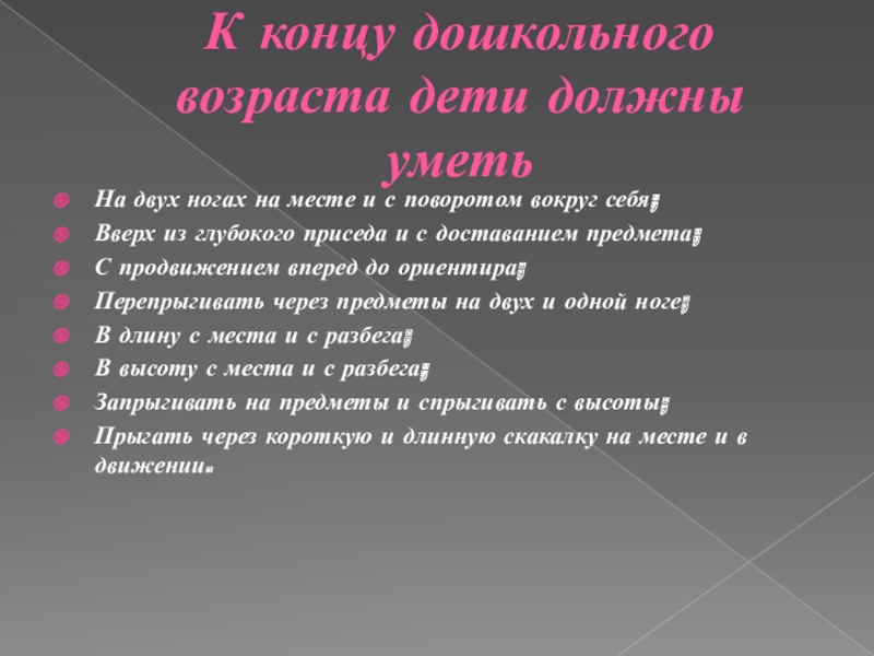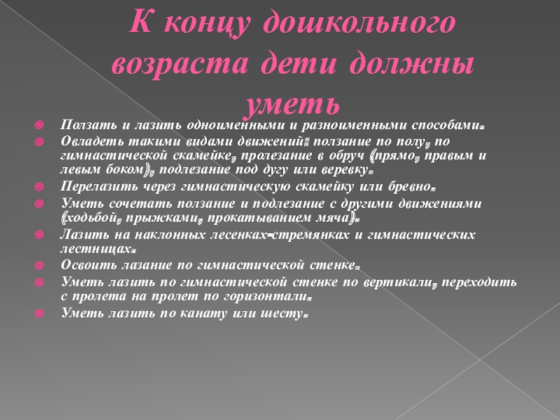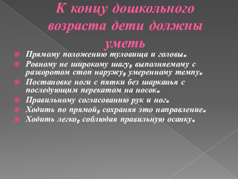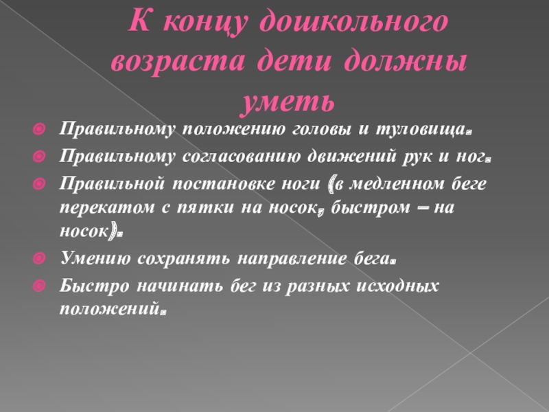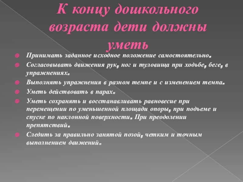 Слайд 40К концу дошкольного возраста дети должны уметь