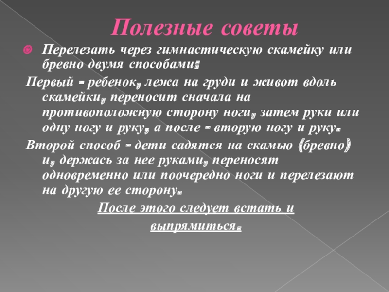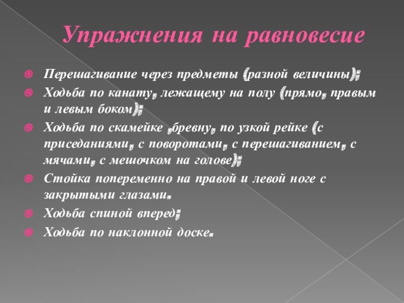 Ходьба по скамейке ,бревну, по узкой рейке (с приседаниями, с поворотами, с перешагиванием, с мячами, с мешочком на голове);