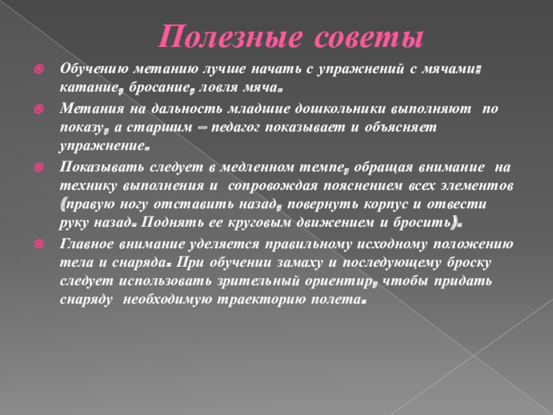 Метания на дальность младшие дошкольники выполняют по показу, а старшим – педагог показывает и объясняет упражнение.