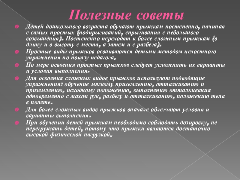 При обучении детей прыжкам необходимо соблюдать дозировку, не перегружать детей, потому что прыжки являются достаточно высокой физической нагрузкой.