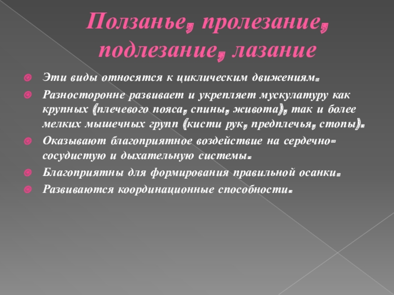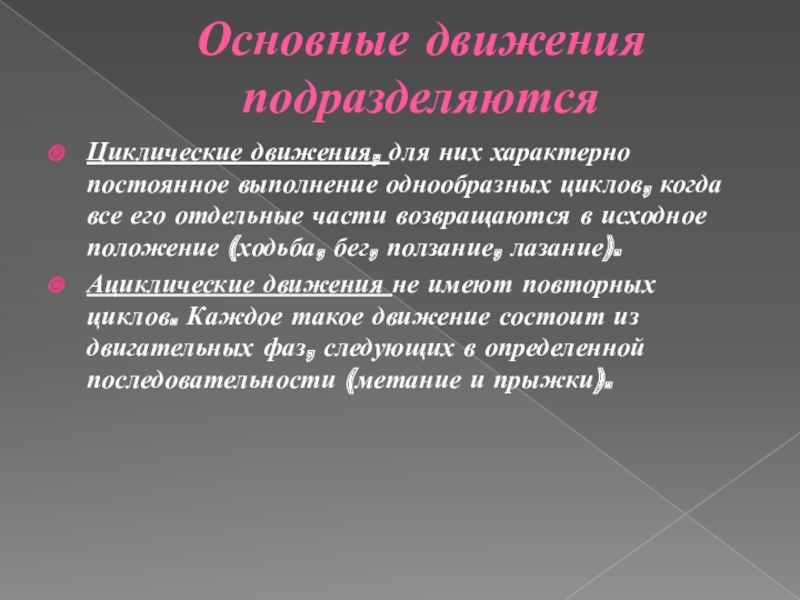циклов, когда все его отдельные части возвращаются в исходное положение (ходьба, бег, ползание, лазание).