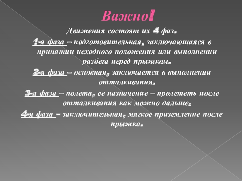 В прыжках с разбега в подготовительной фазе выполняется безостановочный ускоряющийся разбег, переходящий в отталкивание одной ногой.