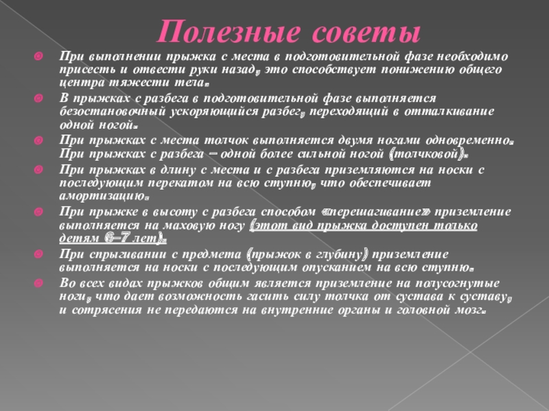 Во всех видах прыжков общим является приземление на полусогнутые ноги, что дает возможность гасить силу толчка от сустава к суставу, и сотрясения не передаются на внутренние органы и головной мозг.