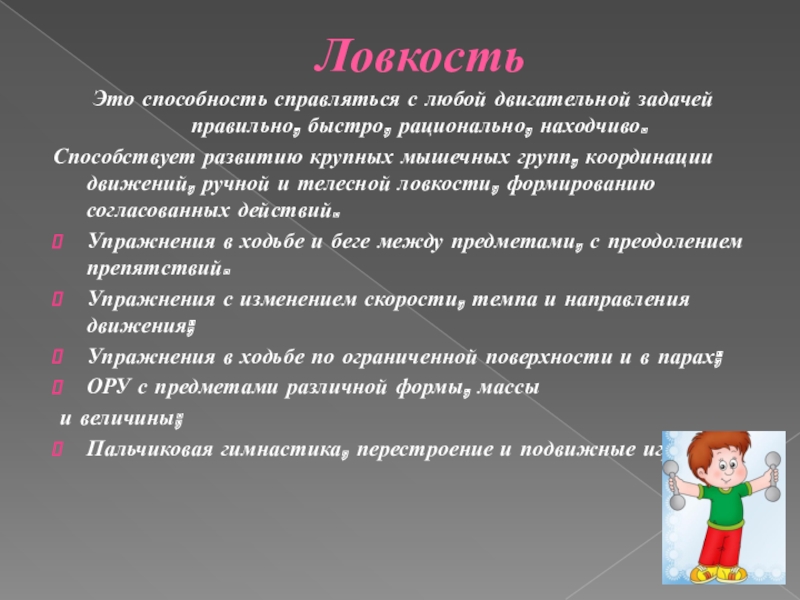 Это способность справляться с любой двигательной задачей правильно, быстро, рационально, находчиво.