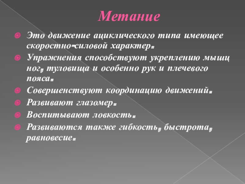 Ациклические движения не имеют повторных циклов. Каждое такое движение состоит из двигательных фаз, следующих в определенной последовательности (метание и прыжки).