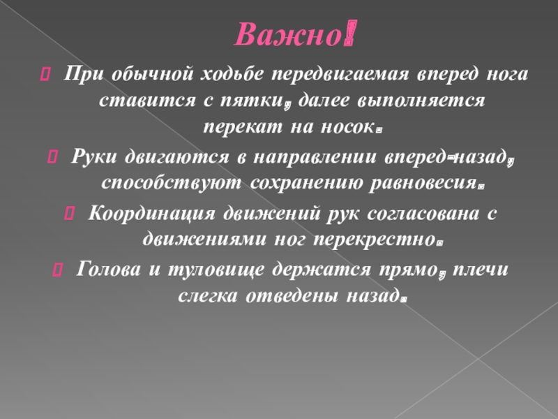 При обычной ходьбе передвигаемая вперед нога ставится с пятки, далее выполняется