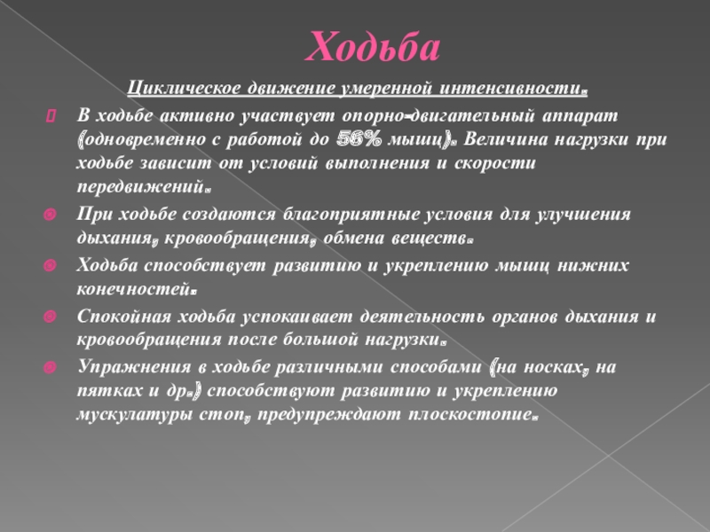работой до 56% мышц). Величина нагрузки при ходьбе зависит от условий выполнения и скорости передвижений.