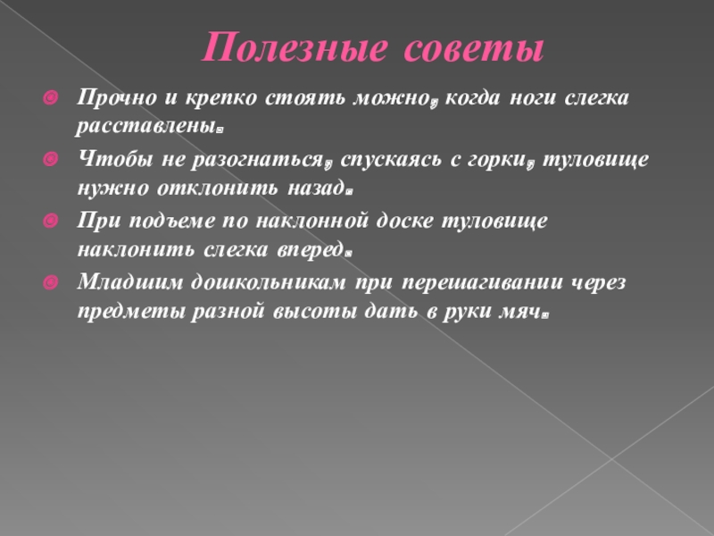 Уметь сохранять и восстанавливать равновесие при перемещении по уменьшенной площади опоры, при подъеме и спуске по наклонной поверхности. При преодолении препятствий.