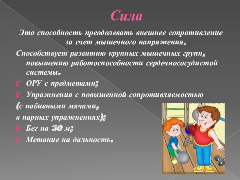 Это способность преодолевать внешнее сопротивление за счет мышечного напряжения.