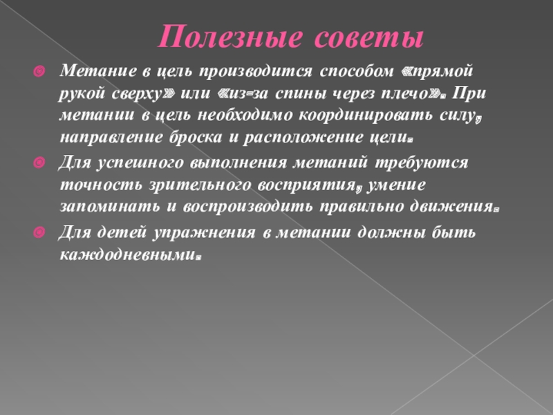 спины через плечо». При метании в цель необходимо координировать силу, направление броска и расположение цели.