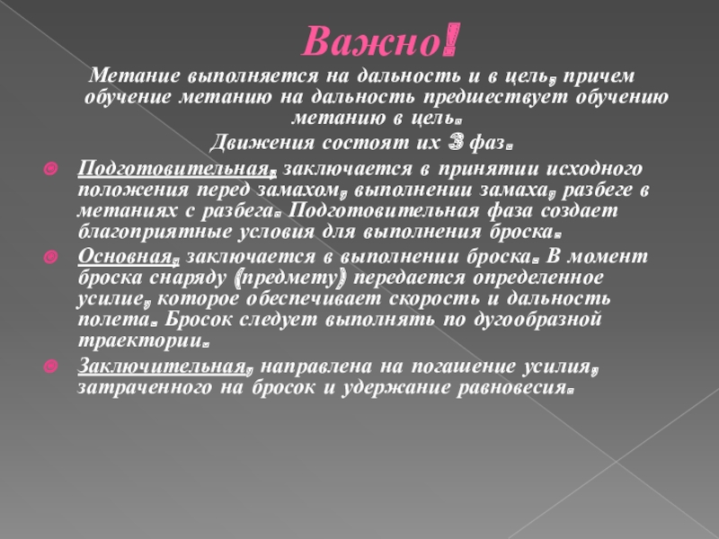 Основная, заключается в выполнении броска. В момент броска снаряду (предмету) передается определенное усилие, которое обеспечивает скорость и дальность полета. Бросок следует выполнять по дугообразной траектории.