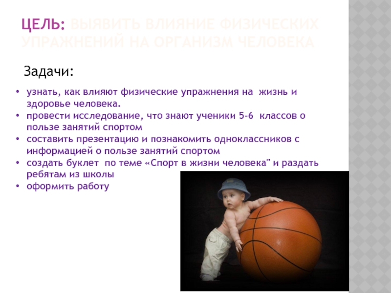 Цель: выявить влияние физических упражнений на организм человекаЗадачи:узнать, как влияют физические упражнения на жизнь и здоровье человека.провести исследование, что знают ученики 5-6 классов о пользе занятий спортомсоставить презентацию и познакомить одноклассников с информацией о пользе занятий