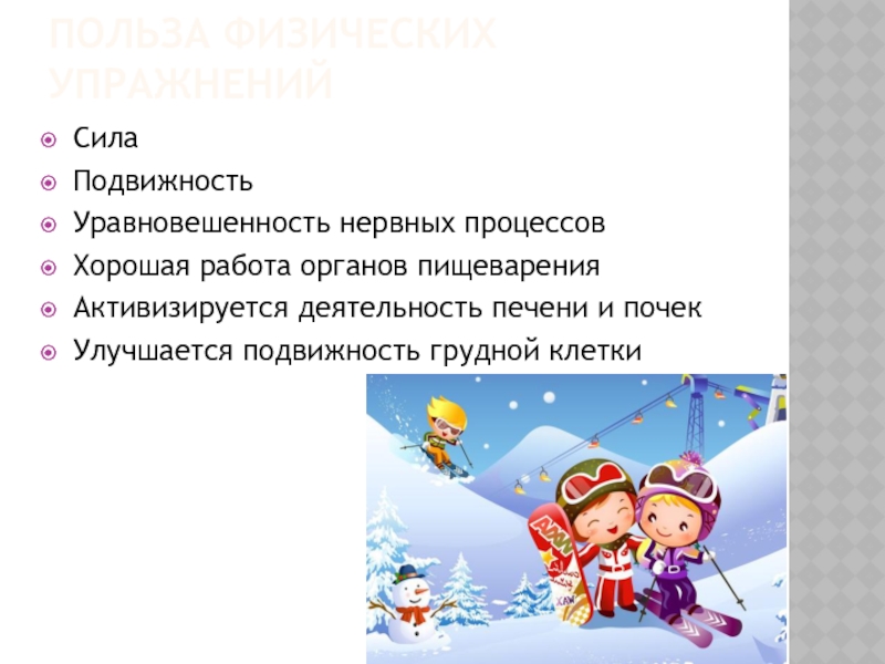 Польза физических упражненийСилаПодвижностьУравновешенность нервных процессовХорошая работа органов пищеваренияАктивизируется деятельность печени и почекУлучшается подвижность грудной клетки