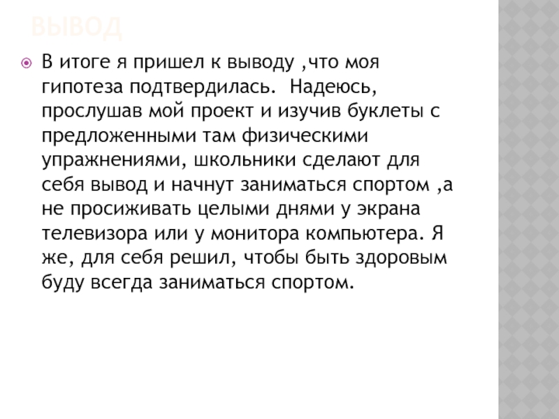 прослушав мой проект и изучив буклеты с предложенными там физическими упражнениями, школьники сделают для себя вывод и начнут заниматься спортом ,а не просиживать целыми днями у экрана телевизора или у монитора компьютера. Я же, для себя решил, чтобы быть здоровым буду всегда заниматься спортом.