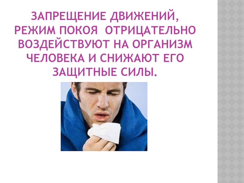 Слайд 9Запрещение движений, режим покоя отрицательно воздействуют на организм человека и снижают