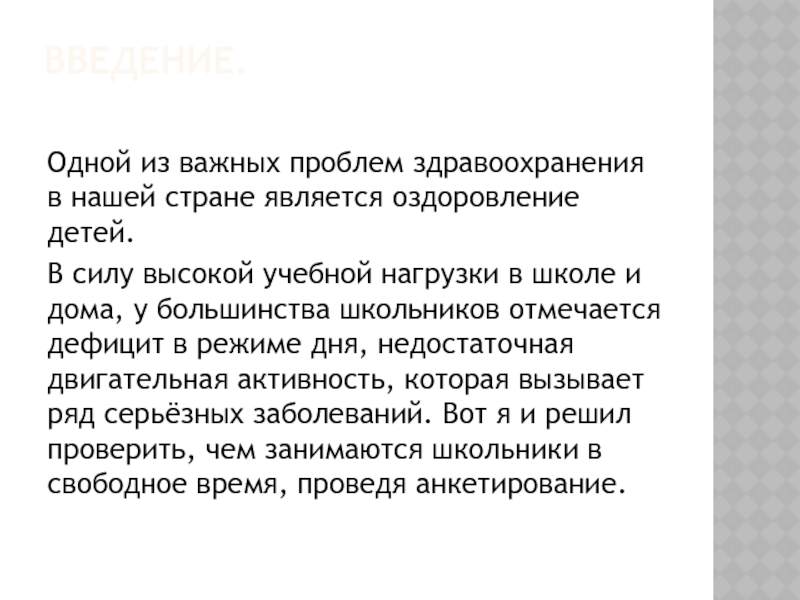 Введение. Одной из важных проблем здравоохранения в нашей стране является оздоровление детей.В силу высокой учебной нагрузки в