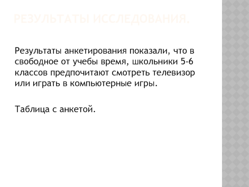 Результаты исследования. Результаты анкетирования показали, что в свободное от учебы время, школьники 5-6 классов предпочитают смотреть телевизор