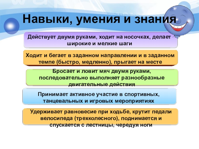 Удерживает равновесие при ходьбе, крутит педали велосипеда (трехколесного), поднимается и спускается с лестницы, чередуя ноги