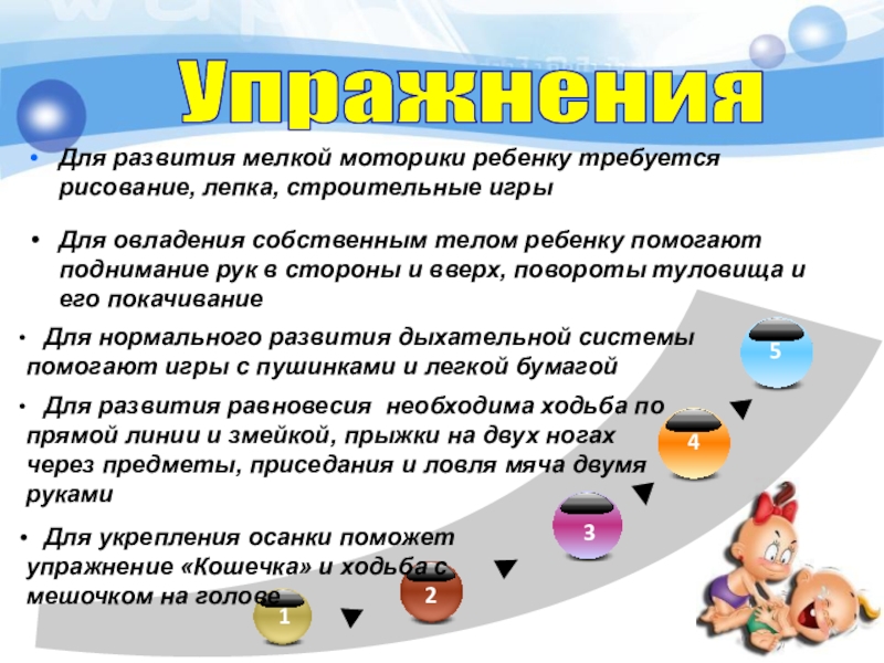 Для развития равновесия необходима ходьба по прямой линии и змейкой, прыжки на двух ногах через предметы, приседания и ловля мяча двумя руками