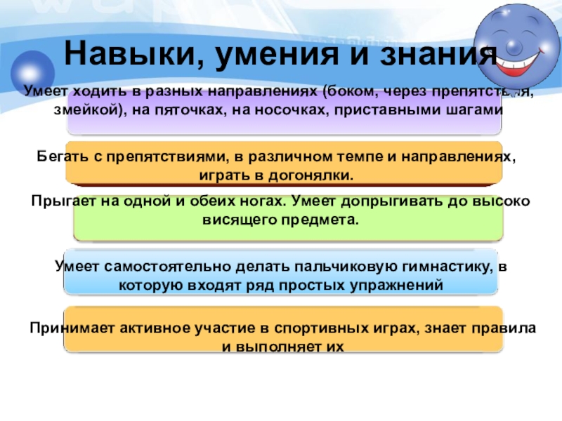 Умеет ходить в разных направлениях (боком, через препятствия, змейкой), на пяточках, на носочках, приставными шагами