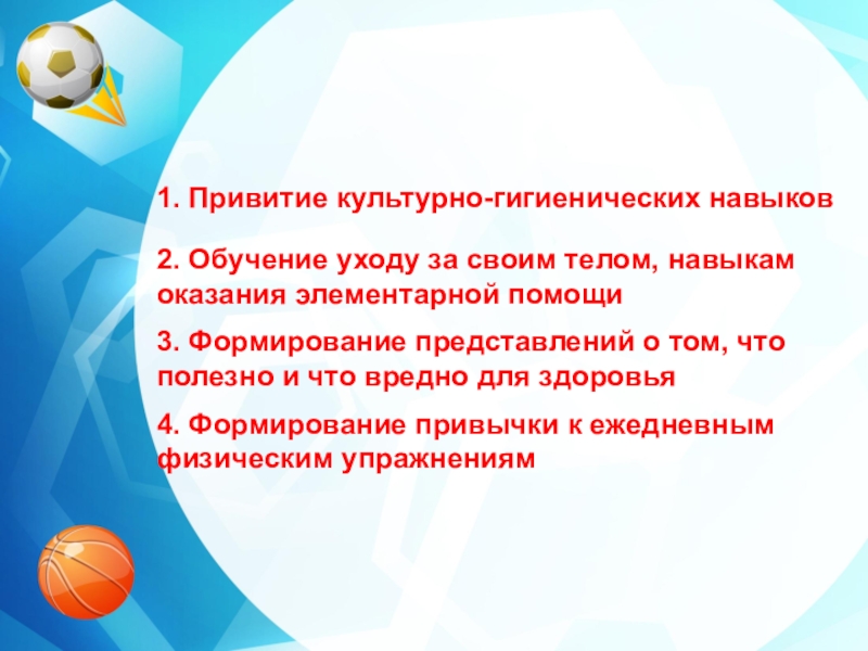 1. Привитие культурно-гигиенических навыков2. Обучение уходу за своим телом, навыкам оказания элементарной помощи3. Формирование представлений о том,