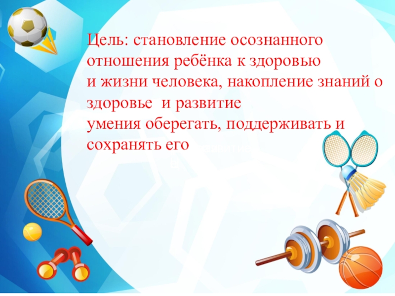развитие развитие раз развитие ЦЦель: становление осознанного отношения ребёнка к здоровью и жизни человека, накопление знаний о здоровье и развитиеумения оберегать, поддерживать и сохранять его