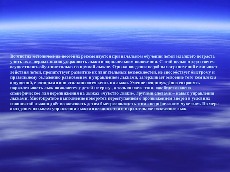 учить их с первых шагов удерживать лыжи в параллельном положении. С этой целью предлагается осуществлять обучение только по прямой лыжне. Однако введение подобных ограничений сковывает действия детей, препятствует развитию их двигательных возможностей, не способствует быстрому и правильному овладению равновесием и управлением лыжами, задерживает освоение того комплекса ощущений, с которыми они сталкиваются встав на лыжи. Умение непринуждённо сохранять параллельность лыж появляется у детей не сразу , а только после того, как будет освоено спецефическое для передвижения на лыжах «чувство лыжи», другими словами – навык управления лыжами. Многократное выполнение поворотов переступанием с продвижением вперёд в условиях извилистой лыжни даёт возможность детям быстрее овладеть этим специфическим чувством. По мере овладения навыком управления лыжами осваивается и параллельное положение лыж.