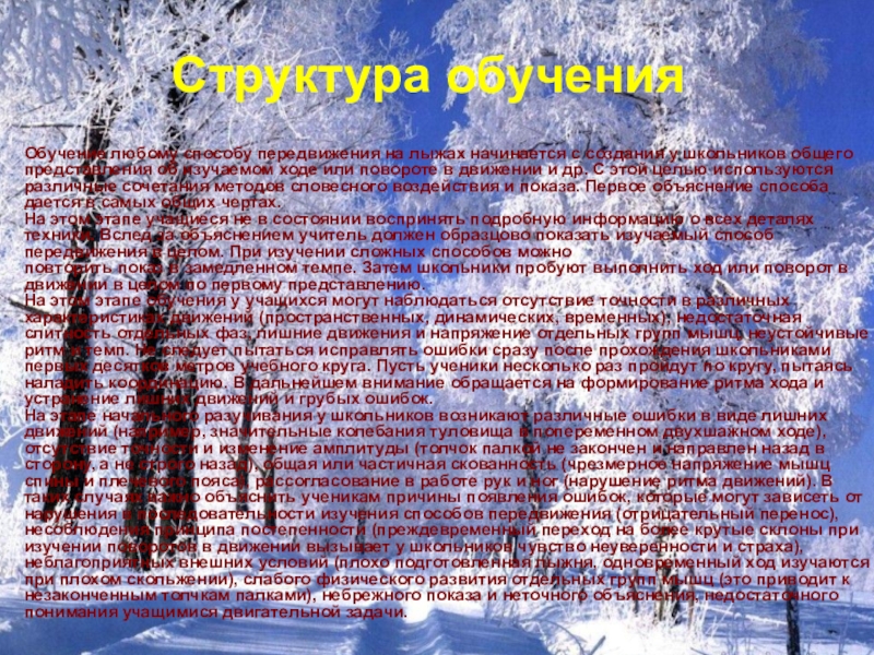 На этапе начального разучивания у школьников возникают различные ошибки в виде лишних движений (например, значительные колебания туловища в попеременном двухшажном ходе), отсутствие точности и изменение амплитуды (толчок палкой не закончен и направлен назад в сторону, а не строго назад), общая или частичная скованность (чрезмерное напряжение мышц спины и плечевого пояса), рассогласование в работе рук и ног (нарушение ритма движений). В таких случаях важно объяснить ученикам причины появления ошибок, которые могут зависеть от нарушения в последовательности изучения способов передвижения (отрицательный перенос), несоблюдения принципа постепенности (преждевременный переход на более крутые склоны при изучении поворотов в движении вызывает у школьников чувство неуверенности и страха), неблагоприятных внешних условий (плохо подготовленная лыжня, одновременный ход изучаются при плохом скольжении), слабого физического развития отдельных групп мышц (это приводит к незаконченным толчкам палками), небрежного показа и неточного объяснения, недостаточного понимания учащимися двигательной задачи.