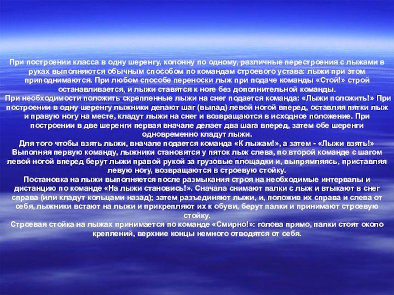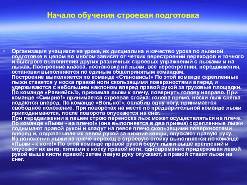 урока по лыжной подготовке в целом во многом зависят от четких перестроений переходов и точного и быстрого выполнения других различных строевых упражнений с лыжами и на лыжах. Построение класса, постановка на лыжи, все перестроения, передвижения, остановки выполняются по единым общепринятым командам.