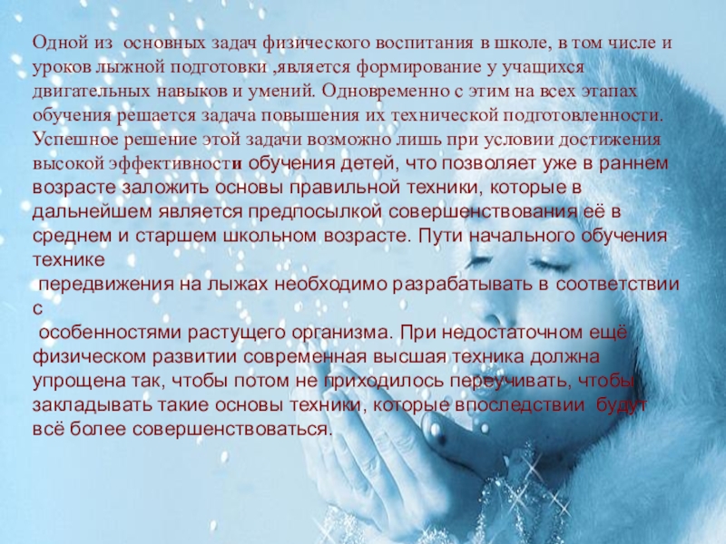 и уроков лыжной подготовки ,является формирование у учащихся двигательных навыков и умений. Одновременно с этим на всех этапах обучения решается задача повышения их технической подготовленности. Успешное решение этой задачи возможно лишь при условии достижения высокой эффективности обучения детей, что позволяет уже в раннем возрасте заложить основы правильной техники, которые в дальнейшем является предпосылкой совершенствования её в среднем и старшем школьном возрасте. Пути начального обучения технике