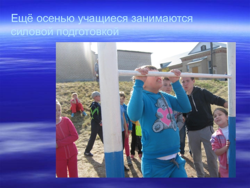 Слайд 4Ещё осенью учащиеся занимаются силовой подготовкой