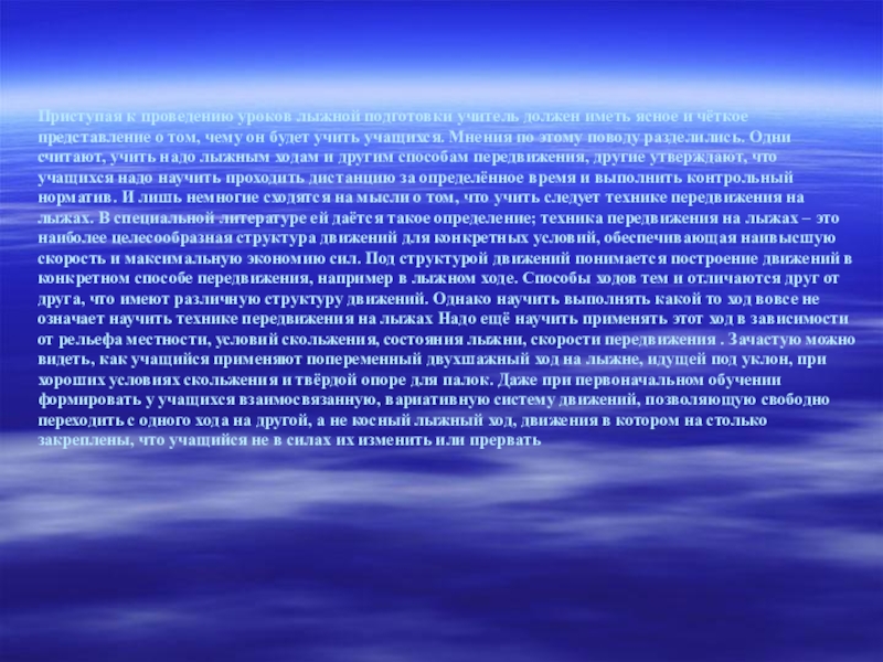 чёткое представление о том, чему он будет учить учащихся. Мнения по этому поводу разделились. Одни считают, учить надо лыжным ходам и другим способам передвижения, другие утверждают, что учащихся надо научить проходить дистанцию за определённое время и выполнить контрольный норматив. И лишь немногие сходятся на мысли о том, что учить следует технике передвижения на лыжах. В специальной литературе ей даётся такое определение; техника передвижения на лыжах – это наиболее целесообразная структура движений для конкретных условий, обеспечивающая наивысшую скорость и максимальную экономию сил. Под структурой движений понимается построение движений в конкретном способе передвижения, например в лыжном ходе. Способы ходов тем и отличаются друг от друга, что имеют различную структуру движений. Однако научить выполнять какой то ход вовсе не означает научить технике передвижения на лыжах Надо ещё научить применять этот ход в зависимости от рельефа местности, условий скольжения, состояния лыжни, скорости передвижения . Зачастую можно видеть, как учащийся применяют попеременный двухшажный ход на лыжне, идущей под уклон, при хороших условиях скольжения и твёрдой опоре для палок. Даже при первоначальном обучении формировать у учащихся взаимосвязанную, вариативную систему движений, позволяющую свободно переходить с одного хода на другой, а не косный лыжный ход, движения в котором на столько закреплены, что учащийся не в силах их изменить или прервать