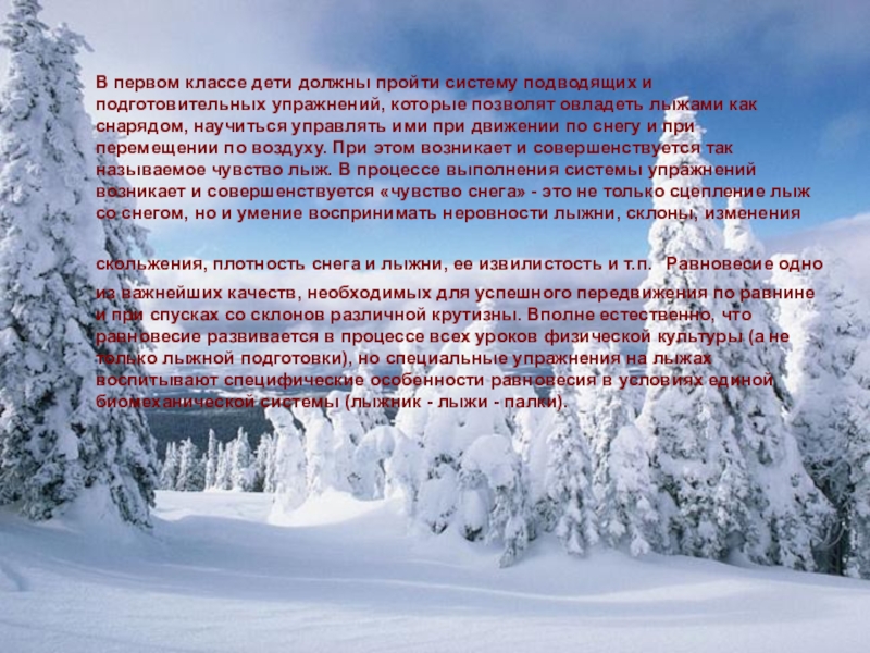 которые позволят овладеть лыжами как снарядом, научиться управлять ими при движении по снегу и при перемещении по воздуху. При этом возникает и совершенствуется так называемое чувство лыж. В процессе выполнения системы упражнений возникает и совершенствуется «чувство снега» - это не только сцепление лыж со снегом, но и умение воспринимать неровности лыжни, склоны, изменения скольжения, плотность снега и лыжни, ее извилистость и т.п. Равновесие одно из важнейших качеств, необходимых для успешного передвижения по равнине и при спусках со склонов различной крутизны. Вполне естественно, что равновесие развивается в процессе всех уроков физической культуры (а не только лыжной подготовки), но специальные упражнения на лыжах воспитывают специфические особенности равновесия в условиях единой биомеханической системы (лыжник - лыжи - палки).