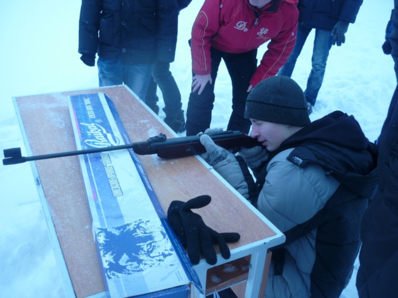 Построение выполняется по команде «Становись!» По этой команде скрепленные лыжи ставятся у носка правой ноги скользящими поверхностями вперед и удерживаются с небольшим наклоном вперед правой рукой за грузовые площадки.