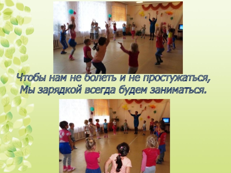 Чтобы нам не болеть и не простужаться, Мы зарядкой всегда будем заниматься.