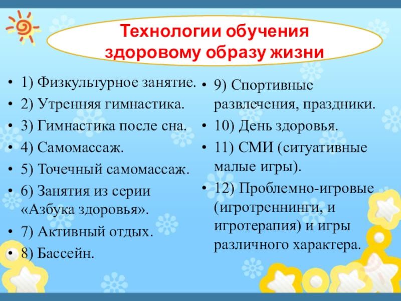 - содействие становлению культуры здоровья, в том числе культуры профессионального здоровья воспитателей ДОУ и валеологическому просвещению родителей.