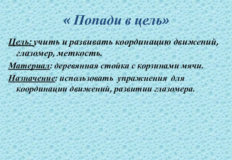 Цель: учить и развивать координацию движений, глазомер, меткость.