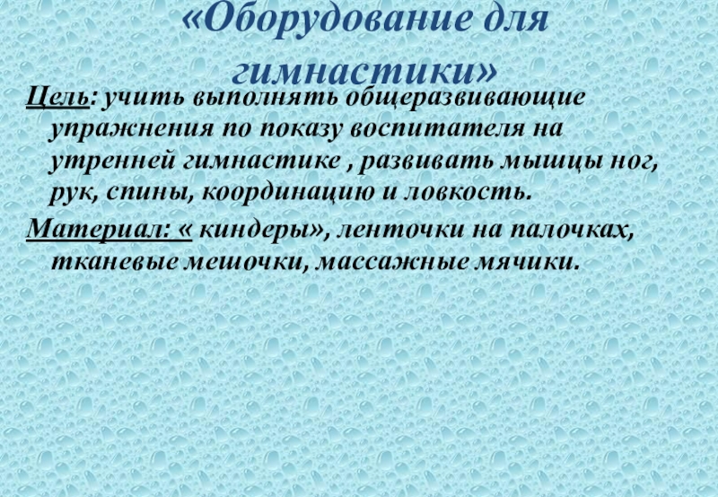 утренней гимнастике , развивать мышцы ног, рук, спины, координацию и ловкость.