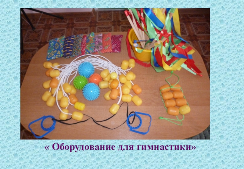 Материал: « киндеры», ленточки на палочках, тканевые мешочки, массажные мячики.