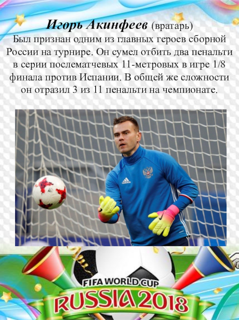 Игорь Акинфеев (вратарь)Был признан одним из главных героев сборной России на турнире. Он сумел отбить два пенальти