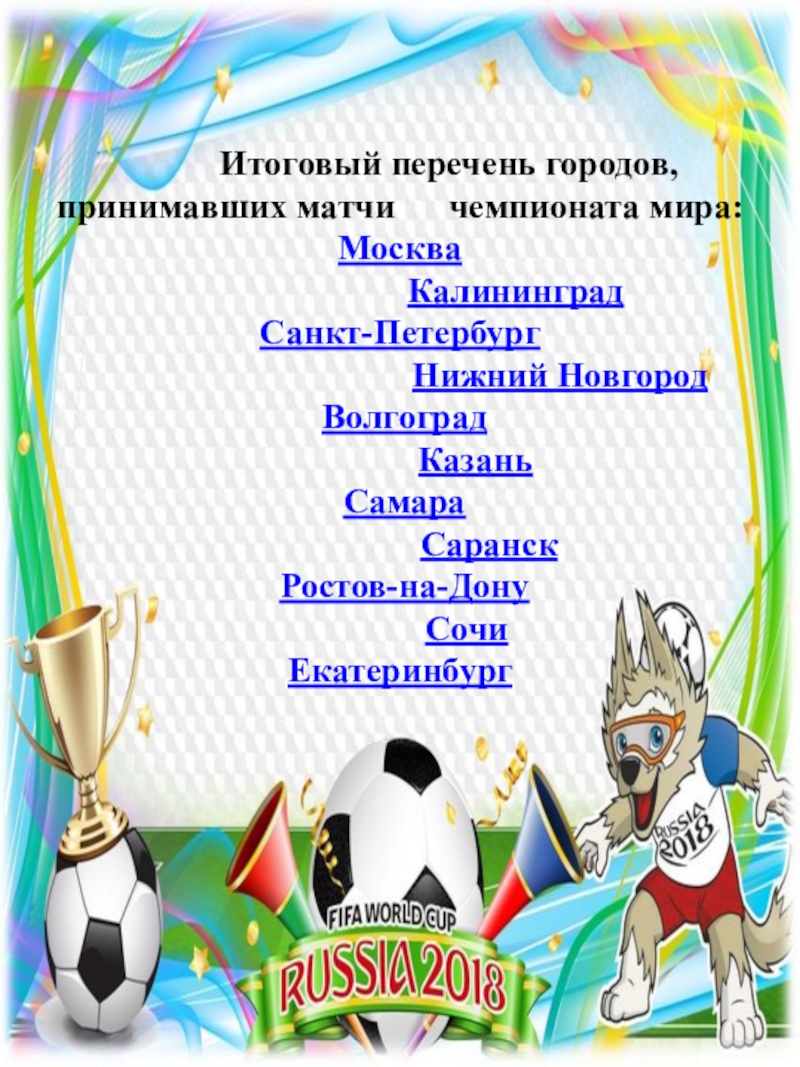 Слайд 3 Итоговый перечень городов, принимавших матчи