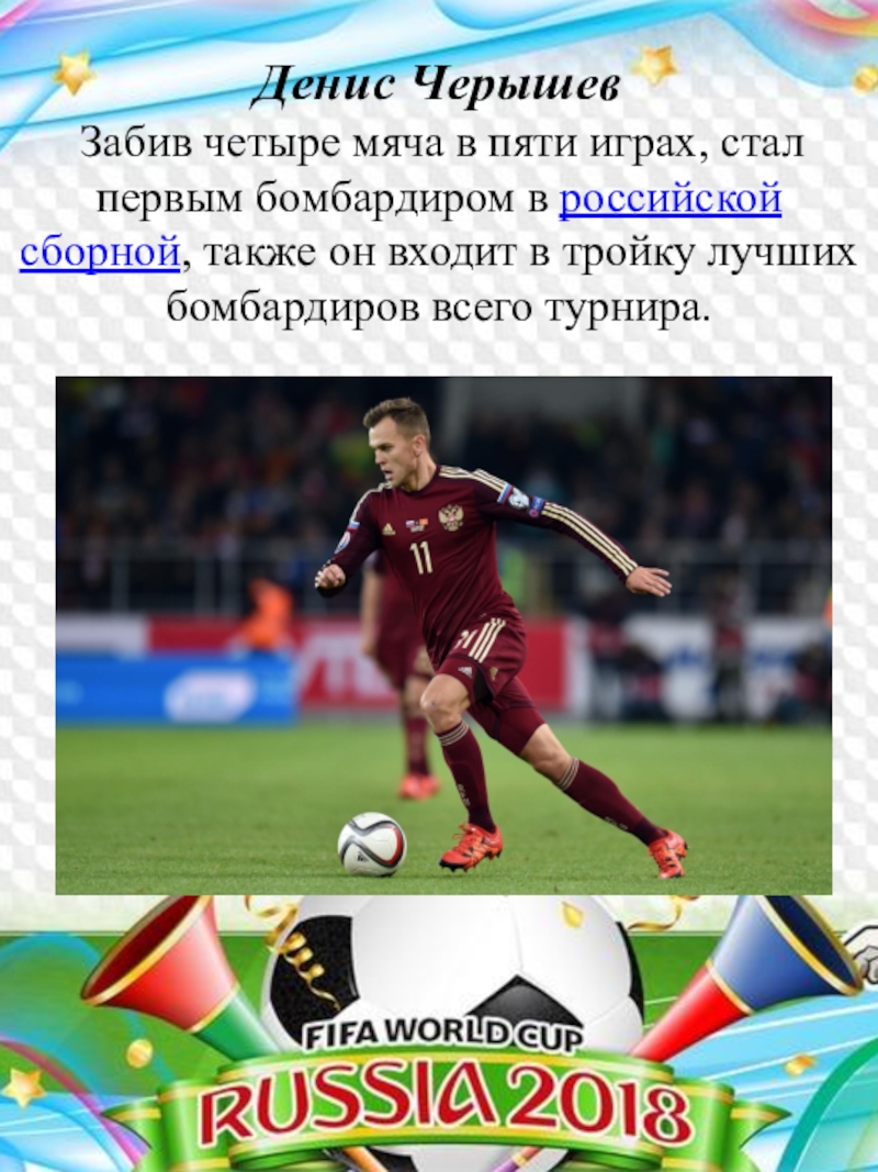Денис Черышев Забив четыре мяча в пяти играх, стал первым бомбардиром в российской сборной, также он входит в тройку