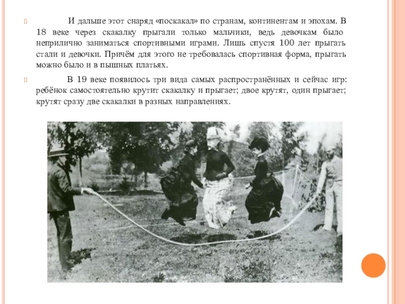 по странам, континентам и эпохам. В 18 веке через скакалку прыгали только мальчики, ведь девочкам было неприлично заниматься спортивными играми. Лишь спустя 100 лет прыгать стали и девочки. Причём для этого не требовалась спортивная форма, прыгать можно было и в пышных платьях.