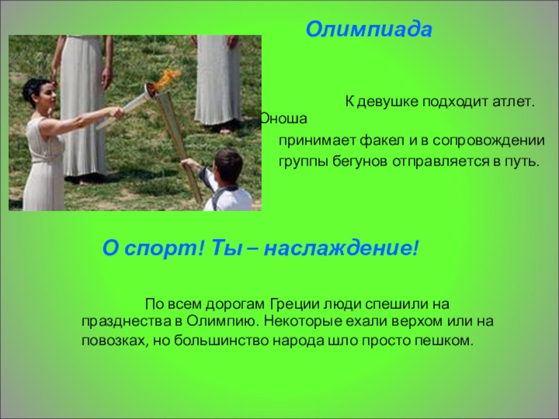 По всем дорогам Греции люди спешили на празднества в Олимпию. Некоторые ехали верхом или на повозках, но большинство народа шло просто пешком.
