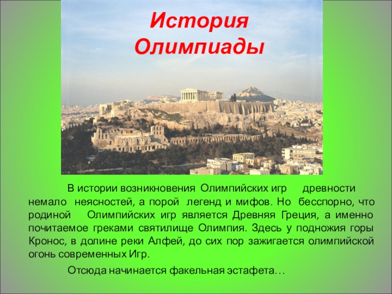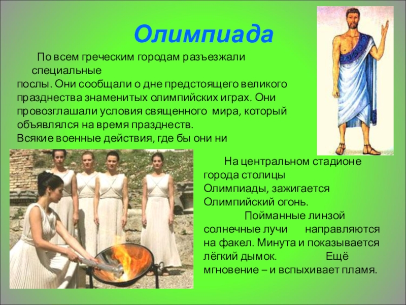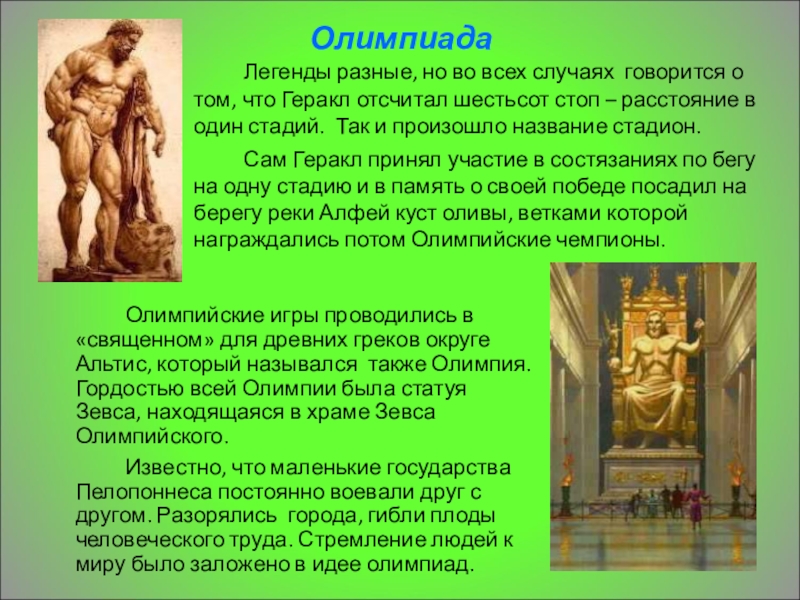 Известно, что маленькие государства Пелопоннеса постоянно воевали друг с другом. Разорялись города, гибли плоды человеческого труда. Стремление людей к миру было заложено в идее олимпиад.