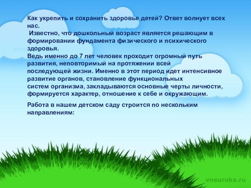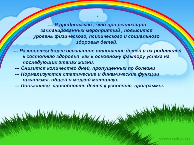 --- Я предполагаю , что при реализации запланированных мероприятий , повысится уровень физического, психического и социального здоровья детей.