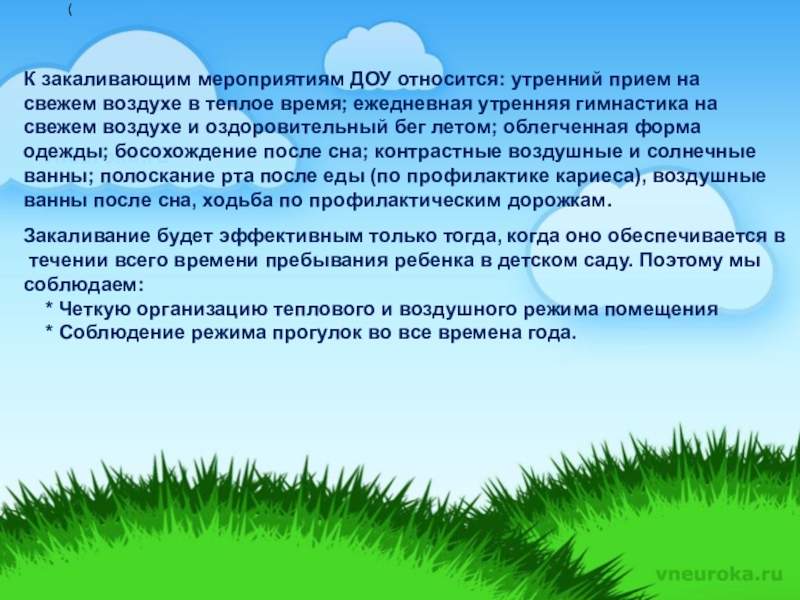 К закаливающим мероприятиям ДОУ относится: утренний прием на свежем воздухе в теплое время; ежедневная утренняя гимнастика на свежем воздухе и оздоровительный бег летом; облегченная форма одежды; босохождение после сна; контрастные воздушные и солнечные ванны; полоскание рта после еды (по профилактике кариеса), воздушные ванны после сна, ходьба по профилактическим дорожкам.