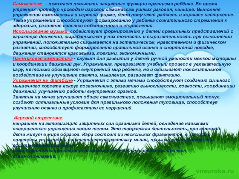 направлен на активизацию защитных сил организма детей, овладение навыками совершенного управления своим телом. Это творческая деятельность, при которой дети живут в мире образов. Игра состоит из нескольких фрагментов, в которые вплетены упражнения на статическую растяжку мышц, прыжки, расслабление для восстановления дыхания.